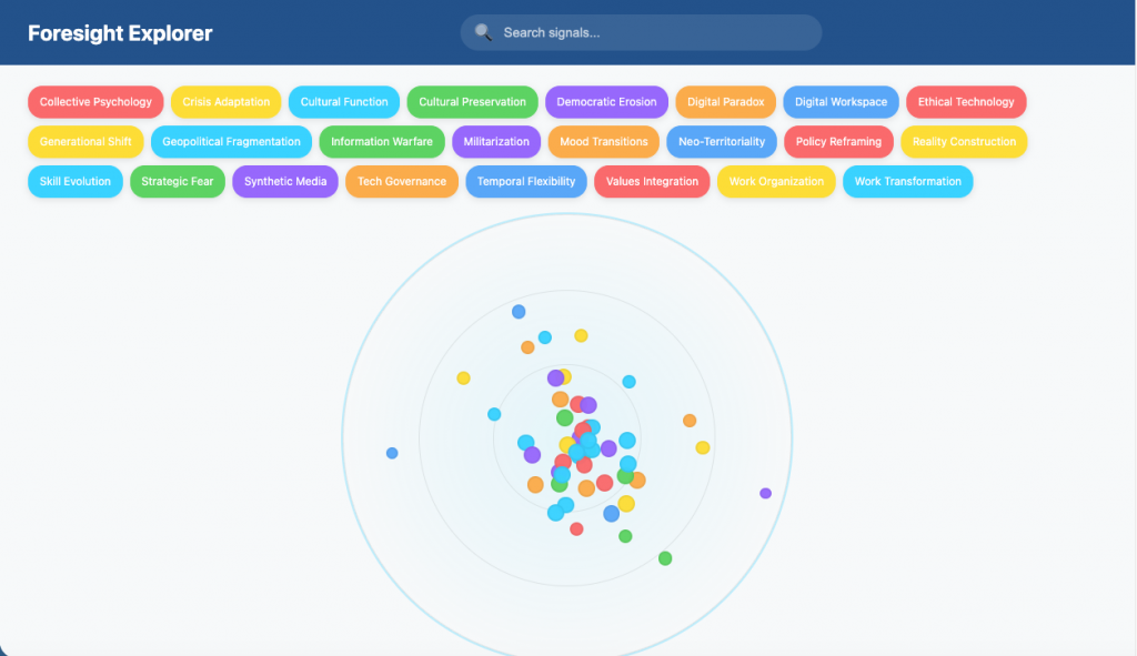 Foresight Explorer is a multidimensional framework for curating, classifying, and mapping weak signals from emerging technologies and sociopolitical shifts. It helps analysts and strategists trace how technical, cultural, and systemic changes interact—revealing early indicators before they surface as mainstream trends. The system combines structured taxonomies with dynamic filtering, turning dispersed developments into coherent strategic intelligence.